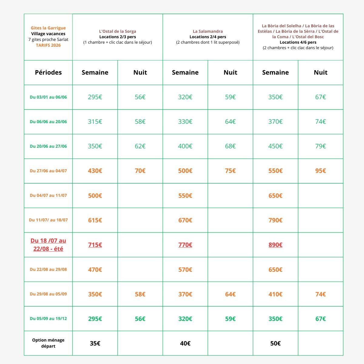 Nos tarifs suivant les périodes.